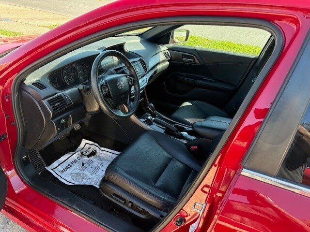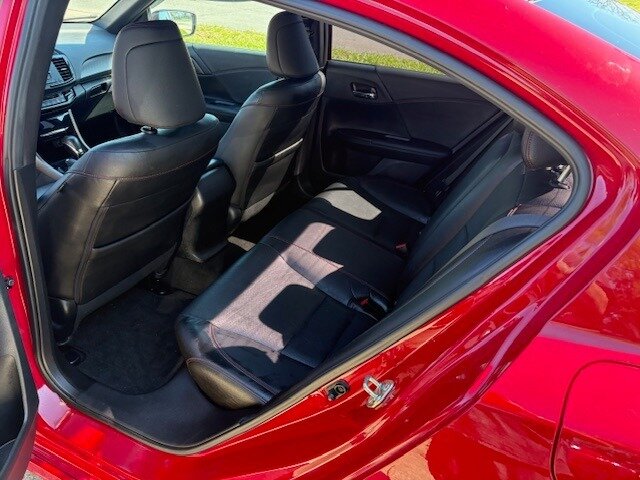 2017 Honda Accord Sport Special Edition in San Marino Red with a Black interior, powered by a 2.4L I4 (189 hp / 182 lb-ft), rated at 26 MPG city and 34 MPG highway. Factory equipment includes sport alloy wheels and sport-tuned suspension, dual exhaust finishers, fog lights and LED daytime running lights, remote keyless entry with push-button start (and remote start), leather-trimmed heated front seats with power-adjustable driver’s seat, aluminum sport pedals, Bluetooth hands-free and audio streaming, USB/Aux inputs with touchscreen audio and multi-angle rearview camera, steering-wheel audio and cruise controls, and automatic climate control. Vehicle is in excellent overall condition.
